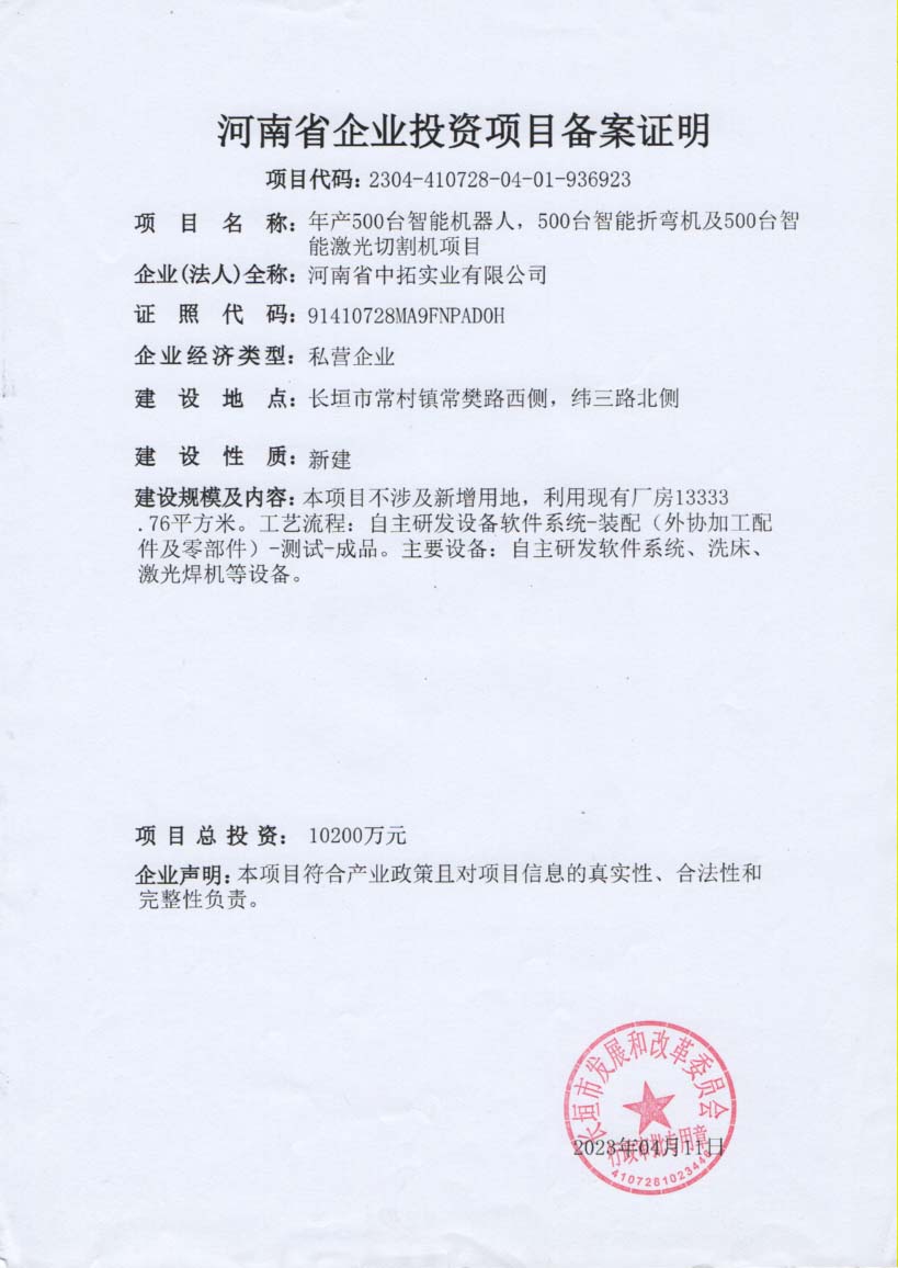 大圣智能折彎機,機械臂,激光切割機工廠備案證明